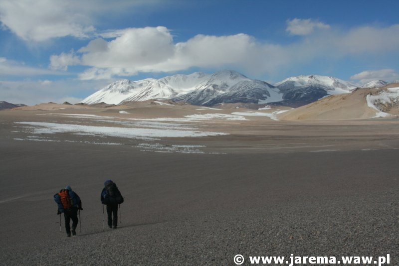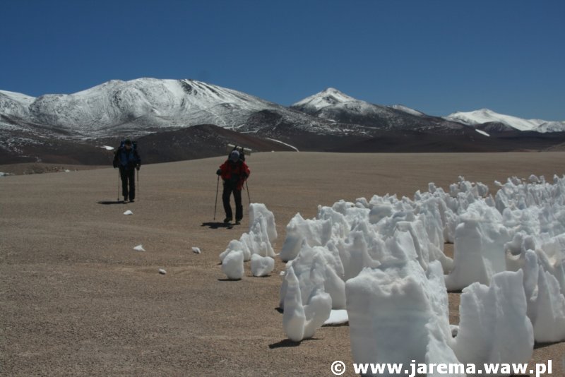 To będzie opowieść o kolejnym powrocie w Andy, kolejnym powrocie na Punę de Atakamę, by eksplorować mało znane jej regiony, jak choćby okolice wulkanu Bonete (czwarta co do wysokości góra Ameryki Południowej) i krateru o intrygującej nazwie Corona del Inca. Nie jestem pewna, czy słowa, muzyka i zdjęcia wystarczą, by wytłumaczyć naszą fascynację Puną. W styczniu tego roku wyruszyliśmy na Punę w pięć osób i tylko dla jednej była to pierwsza wyprawa w ten region. Po doświadczeniach z zeszłego roku byliśmy przygotowani na wszystkie kaprysy Puny, czyli śnieżyce, burze i nieustający wiatr. Tym razem było inaczej – sporadyczne opady śniegu, słońce i widoczność na ponad 100 km. Tylko wiatr nie ustał. Puna pokazała nam jeszcze więcej swoich kolorowych jezior, lagun, skał, wulkanów, zwydmionych piasków, ale za to mniej roślin i zwierząt. Tym razem była bardziej surowa i bezkresna. Przemierzając ją i rozglądając się wokół czuliśmy się jak ślimaki, które mają przejść od morza do Tatr. I tylko dzięki temu, że GPS-y odnotowywały kolejne kilometry, nabieraliśmy pewności, że jednak idziemy do przodu i być może dojdziemy do celu, być może odnajdziemy Coronę del Inca, być może wejdziemy na szczyt Bonete. Podczas 20-dniowej akcji górskiej przeszliśmy dziesiątki kilometrów bezkresnej pustynno-wulkaniczno-śnieżnej Puny, mijając po drodze jedynie niemych, lodowych pokutników. Ciągłe wypatrywanie właściwej drogi, a do tego brak śladów bytności istot ludzkich (szczególnie w regionie Bonete), sprawiały, że czuliśmy się, jak prawdziwi poszukiwacze.